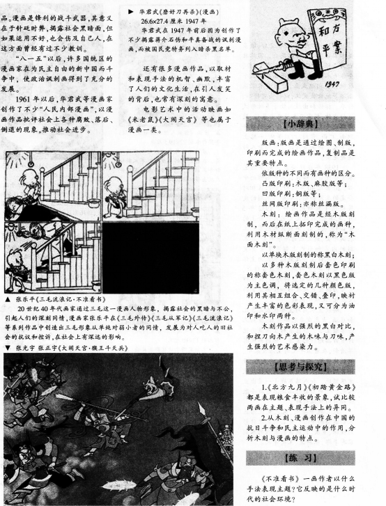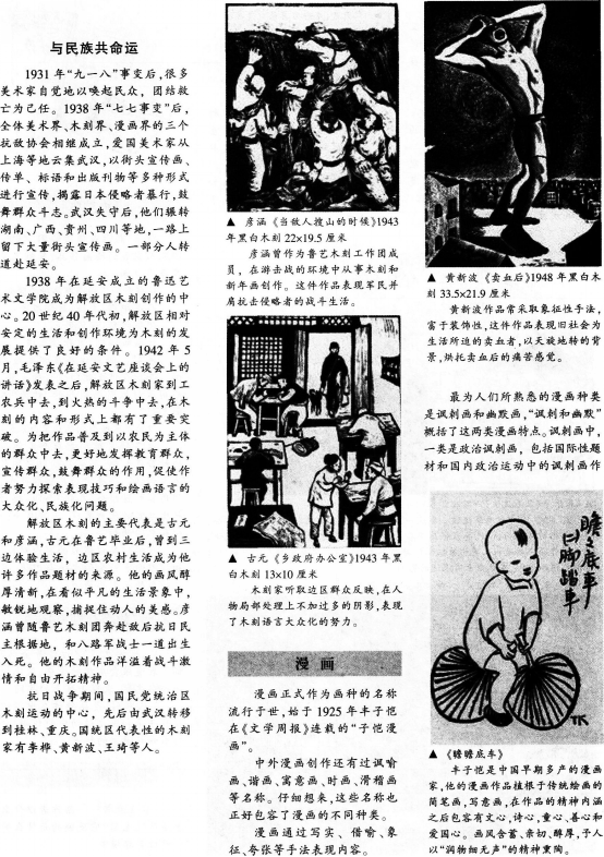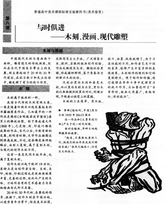 【课题】与民族共命运——木刻与漫画 【课型】新授课 【课时】1课时 【教学目标】 知识与技能:了解木刻既有传统渊源又是新兴的美术门类的特点和发展脉络。 过程与方法:学生认识美术的社会作用,体会文艺家对国家民族的使命感。 情感、态度和价值观:提高对美术学科的学习兴趣,体验木刻与漫画的神奇。 【教学重点】学生了解版画的分类、作用以及深刻的内涵。 【教学难点】理解版画其中蕴含的情感。 【教学过程】 (一)导入 出示徐悲鸿《奔马》、司徒乔《放下你的鞭子》《“七七”的号角》等作品,引导学生讨论分析作品的时代背景和特殊的意义。 指出:在抗日战争和民主革命运动中,美术家与民族共命运,表现了可贵的爱国热情和历史的使命感。但在当时,以画笔为武器,积极投身于抗日救亡和民主革命运动的最多的是木刻家和漫画家。 (设计意图:以多媒体播放革命版画作品导入,激发学生的爱国情感,顺利引入新课) (二)新课 1.提出问题讨论 木刻的特点与制作方法有哪些 漫画有哪些种类与特点 讨论指出:中国20世纪30年代初期出现由鲁迅倡导,以进步美术青年为主力的木刻创作运动。中国古代木刻版画具有悠久的历史,但这种版画都是刻工复刻画师的原稿,是一种复制木刻。这种木刻大约在14世纪初传到欧洲,到19世纪欧洲产生了创作木刻。创作木刻的特点是不模仿、不复制,刻者自己以刀代笔,以木代纸或布,完全由刻者自己创作,刻家就是画家。 2.作品鉴赏 师:你喜欢哪件作品 (请3位同学发言) 作品有什么样的艺术特色 (反映人民疾苦,揭露黑暗的社会现实) 教师小结:木刻在抗日战争和民主革命运动中发挥过巨大战斗作用,美术家与民族共命运。表现了可贵的爱国热情和历史的使命感。 (三)实践 教师展示李桦的《起来,饥寒交迫的奴隶》和古元《乡政府办公室》两幅木刻版画作品,引导学生四人一小组欣赏讨论。教师巡视指导。 (设计意图:学生运用所学知识及时巩固。大胆发表看法) (四)展示 学生选取代表发表看法,同学互评,教师小结。 (设计意图:展示自己,风采飞扬,教师起到良好的引导与总结的作用) (五)课堂小结 教师与学生共同总结:木刻和漫画创作始终坚持现实主义的创作方法,反映人民疾苦,揭露黑暗的社会现实,成为二十世纪三四十年代最活跃和最有战斗性的美术运动之一。 (设计意图:巩固知识,提升学生对版画的喜爱程度) (六)课外延伸 教师提问:漫画的本义是什么 和我们当今喜欢的漫画有什么不同 漫画有哪些著名艺术家 你喜欢谁的哪件作品 下节课老师就听同学们讲一讲。 (设计意图:以设疑的方式,为下节课做好完美铺垫) 【板书设计】() 【教学反思】()