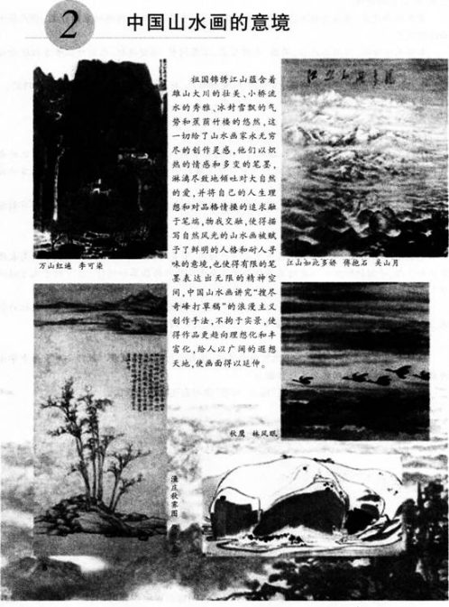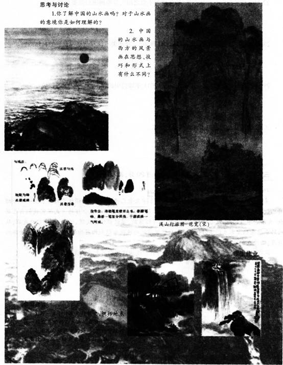 【课题】《中国山水画的意境》 【课型】新授课 【课时】1课时 【教学目标】 (1)知识与技能:欣赏中国山水画作品,感受历代画家是如何借山川之景抒画家之情的,是如何在丰富多彩的自然美中表达中国人的自然观和审美观的。 (2)过程与方法:通过分析山水画作品中意境的表现,初步理解对意境的营造是画家追求的艺术境界,是山水画的灵魂。 (3)情感、态度与价值观:本课注重培养学生对中国山水画的分析、理解,了解山水画的成就及有关画家,使学生热爱中国传统绘画,感受自然与艺术的丰富多彩,从而更加热爱大自然、热爱生活。 【教学重点】 通过对山水画构图、空白、墨色的分析,使学生了解中国山水画是怎样表现意境的。 【教学难点】 中国山水画与西方风景画在思想、技巧和形式上的不同点是什么。 【教学过程】 环节一:交流导入 1,请大家静下心来听我们教室中回响的音乐,边听音乐边来看几张风景图片。(桂林山水甲天下的漓江,世外桃源的泸沽湖,美丽神秘的九寨沟) 2,中国的自然山水十分美好,这些大河山川是我国山水画家的主要绘画题材。(看中国山水画——古代和当代),由此引出课题。 (设计意图:烘托氛围,激发学生的兴趣,更好地进入接下来的课程) 环节二:新课讲授 教师提问:你了解中国山水画吗 对山水画有什么感受 学生思考并回答,教师小结:中国的山水画不仅描绘了自然山水,而且寄托了画家个人的情感和理想。同时也表达了画家的主观感受。 师:大家坐在这样一个现代化的教室里,一定觉得中国山水画离我们好遥远,但现在我们就要借助这些现代化的设备来和我们的传统艺术做一次亲密接触。 展示历代文人墨客留下了大量描写山川的美好诗句,请小组汇报搜集的有关诗句。 欣赏感受 教师提问:这是谁的作品 采用的是什么构图形式 画面画的是什么内容 你想到了一首诗吗 作者展现了怎样的意境 教师小结:著名山水画大师李可染先生画的《万山红遍》画面采用直构图,以体现山的宏伟气势、山树森茂、重重叠叠,几道瀑布飞泻而下,打破了画面的沉静;那道道弯弯的泉水,不仅穿透画面的直构图。使画面生动多姿,更使人如身临一个理想的、充满诗情画意的王国。 设问:指出下列山水画属于哪种艺术风格 教师小结:中国山水画作为一个独立的画科,在长期的发展中,形成了多种画法和艺术风格。主要有:青绿山水、水墨山水、浅绛山水等。 中国山水画在空间的处理上,采用“以大观小”“小中见大”的手法。 就是把山水画家自己看作是一个巨人,面对自然,就像人观盆景状。这样,千里江山也可尽收眼底,或用长卷的形式表现,或以中国画特有的高远、平远、深远的构图方法,画十分繁复的山岭,中国山水画创造的这种独特的处理空间关系的艺术手法,既体现了中国画家独特的观察自然的方法,同时也蕴含着中华民族的审美胸襟,体现了中国人的自然观。 教师示范墨分五色以及表现各种山石的皴法,如披麻皴、雨点皴、荷叶皴。笔法中包含上述的山石的多种皴法和点苔法等;墨法中湿者为“染”,干者为“擦”,还有“破墨”、“积墨”等。 (设计意图:循循善诱,穿插对具体作品的分析,让学生更加深刻地感受山水画的意境) 环节三:巩固实践 观看一段农夫山泉的山水广告片,小组讨论片子展现了怎样的意境 中国的自然山水十分美好,与中国的山水画有什么关系 你觉得山水画把自然山水的美表现出来了吗 在画中,除了自然的景色还有其他的内涵吗 作业要求:选几句你喜欢的诗句,用你学过的笔墨技法,画一幅有意境的山水画。 环节四:展示评价 学生山水作品欣赏,同学问互评,教师小结。 环节五:课后拓展 观察自然风景,通过绘画或者诗句的方式表达自己的感受。 【板书设计】 中国山水画的意境 笔法:中锋运笔、侧锋运笔 墨法:积墨法、破墨法 皴法 【教学反思】()