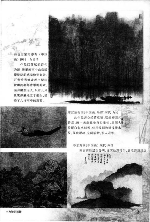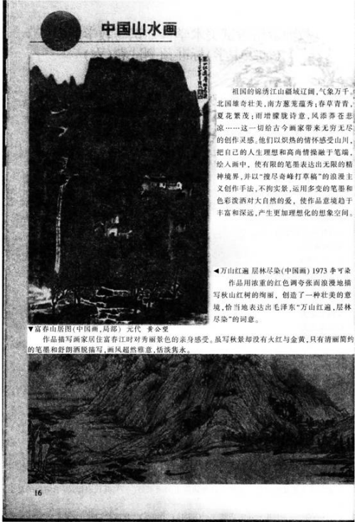 【课题】中国山水画 【教学目标】 知识与技能:欣赏中国山水画作品,感受历代画家是如何用山川之景抒画家之情的,初步理解意境营造是画家追求的艺术境界,是山水画的灵魂。 过程与方法:通过观察思考、比较等得到美的体验,领悟山水画的艺术美。学生能概括地表达出所喜欢的山水画的意境;或用学过的笔墨技法,画一幅有意境的山水画,并配上自己喜欢的诗句。 情感、态度与价值观:注重对中国山水画的分析、理解,了解山水画的成就及有关画家,热爱中国传统绘画。 【教学重点】 1,通过对山水画构图、空白、墨色的分析,使学生了解中国山水画怎样表现意境。 2,山水画的树石绘画步骤与方法。 【教学难点】 中国山水画的思想、技巧和形式表现;在山水画的树石绘画中体会笔情墨趣。 【学习材料】 教具:多媒体设备,山水画所需用具。 学具:风景照片、山水画、纸、墨、笔等中国画的必需用品。 【教学过程】 一、导入新课 教师多媒体展示中国画图片,引导学生回顾中国画的基本分类,引出中国山水画这一课题。 二、对比了解。新课讲授 1,教师继续展示并依次简单介绍中国山水画作品:①《富春山居图》(元)黄公望;②《搜尽奇峰打草稿》(清)石涛;③《青绿山水画》《浅绛山水》(现代)张大干;④《万山红遍》(现代)李可染。 学生欣赏观察这一系列作品,并思考:山水画的意境和不同的表现形式分别是怎样的 学生回答问题,教师小结:认识意境是山水画的灵魂,追求意境的创造是中国山水绘画的独特的艺术传统之一。 2,教师追问:作品当中蕴含的意境都与什么有关系 学生分组讨论问题并回答,教师总结补充:与画家的主观感受等有密切关系。 (设计意图:通过展示中国山水画名作,使学生感受中国画的艺术境界,引起学生创作兴趣) 三、欣赏分析。巩固提高 1,引导学生欣赏中国画作品《平沙落雁》,并配合播放音乐古曲平沙落雁。学生欣赏,自由描述自己所看到的画面并体会画面意境。 2,教师提问:通过观察作品,讨论分析。进一步分析中国山水画家是如何表现意境的 学生回答,教师总结: ①位置经营,构图表现;②“画中有诗,诗中有画”——诗意的追求;③水墨韵味,墨彩交融。 (设计意图:使学生明确中国山水画表现意境的方法) 四、造型表现,学生创作 1,教师提出作业要求:尝试练习用中国画工具画一棵树木或一组山石:注意体现体积与质感:而后选择一首古诗,根据诗词描绘一幅中国山水画。 学生创作,教师巡视指导。 2,师生进行作品的展示与评价,主要从作品的构思、笔墨以及意境等方面进行评价。 (设计意图:鼓励学生大胆创作,培养学生实践创作能力) 五、小结作业 师生总结课堂主要内容,并鼓励学生课下选择自己感兴趣的中国山水画作品进行临摹,下节课同学之间可以相互交流欣赏。