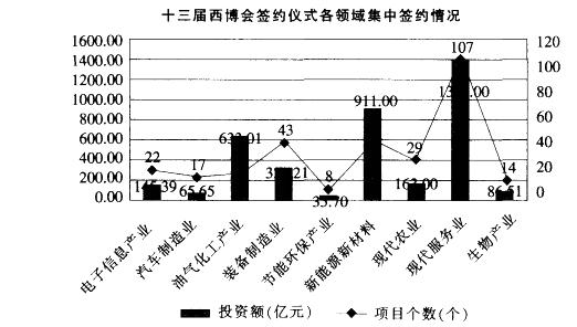 2012年9月26日下午,第十三届西博会中国西部投资说明会暨经济合作项目签约仪式(以下简称“西博会签约仪式”)在成都举行。在此次签约仪式中共集中签约400个项目,投资额达到5067.66亿元,较上一届增长28.43%。