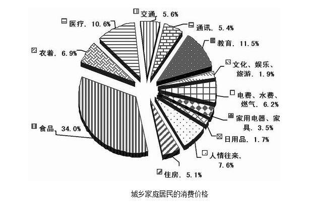 2008年中国家庭居民的消费水平持续提高,与2006年社会状况综合调查结果比较,消费支出总额从17388元升高到22555(未考虑价格变动的因素),消费结构也进一步完善,作为家庭生活水平的恩格尔系数(家庭食品支出占消费支出的比例)进一步降低。在2008年城乡家庭消费支出细项中,列前三位的消费类型是食品.教育和医疗,分别占总支出的34.0%.11.5%和10.6%