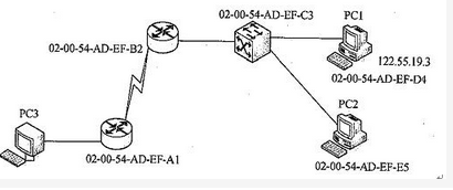 如果在下图的PC3上运行命令arp122.55.19.3,则得到的MAC地址是()。