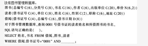 D.图书,总编号=借阅.总编号AND读者,借书证号=借阅,借书证号