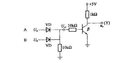 图示电路中,二极管视为理想元件,即正向电压降为零,反向电阻为无穷大。三极管的β=100。输入信号U A、UB的高电平是3.5V,(逻辑1),低电平是0.3V(逻辑0),若该电路的输出电压U0为电压平时定为逻辑1,图所示电路应为: