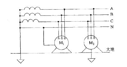 在图示的三相四线制低压供电系统中,如果电动机M1采用保护接中线,电动机M2采用保护接地。当电动机M2的一相绕组的绝缘破坏导致外壳带电,则电动机M1的外壳与地的电位应: