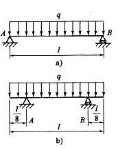 <p>承受均布载荷的简支梁如图a)所示,现将两端的支座同时向梁中间移动l/8,如图b)所示,两根梁的中点l/2处)弯矩之比Ma/