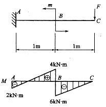 悬臂梁的弯矩如图示,根据梁的弯矩图,梁上的载荷 F、m的值应是: