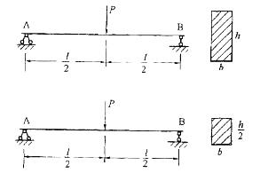 <p>如图所示两根梁中的l,b和P均相同,若梁的横截面高度h减小为h/2,则梁中的最大正应力是原梁的多少倍? <img alt
