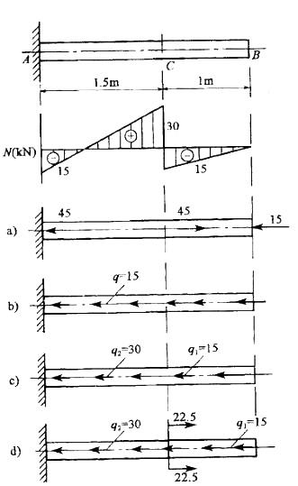 已知图示等直杆的轴力图(N图),则该杆相应的荷载图如哪个图所亦?(图中集中荷载单位均为kN,分布荷载单位均为kN/m)