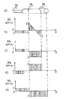 阶梯轴如图a)所示,巳知轮1、2、3所传递的功率分别为N1=21KW,N2=84KW,N3=63kW,轴的转速n=200rad/min,图示该轴的扭矩图中哪个正确?