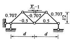 <p>图所示为超静定桁架的基本结构及多余为知力X=1作用下的各杆内力,EA为常数,则为( )。 <img alt=""