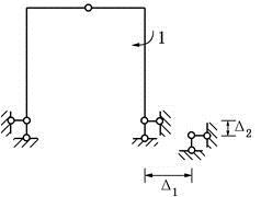 如图所示的一三铰刚架,其右支座发生了位移,位移的水平分量为Δ1,竖向分量为Δ2,则右半部的转角为( )。