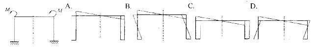 左图所示对称刚架受同向结点力偶作用,弯矩图的正确形状是右侧四个图中的: