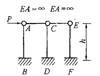 图示排架,已知各单柱柱顶有单位水平力时,产生柱顶水平位移为δAB=δEF=h/100D,δCD=h/200D,D为与柱刚度有关的给定常数,则此结构柱顶水平位移为: