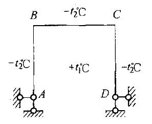 图示结构(杆件截面为矩形)在温度变化t1>t2时,其轴力为: