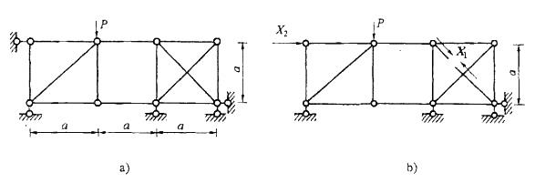 如图a)所示桁架,EA=常数,取图b)为力法基本体系,则力法方程系数间的关系为: