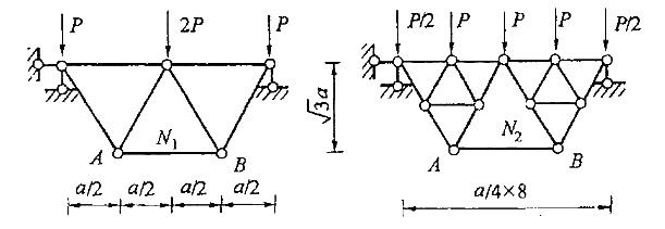 <p>图示两桁架结构杆AB的内力分别记为N1和N2。则两者关系为: <img alt="" src="https://lear