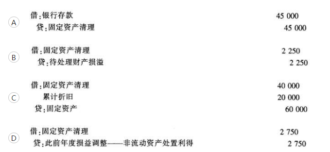 某企业将一台不需要用的设备对外出售,其账面原价为60000元,已提折旧20000元,售价为45000元,价款已存入开户银行,该设备已清理完毕,下列会计分录中,正确的有()。