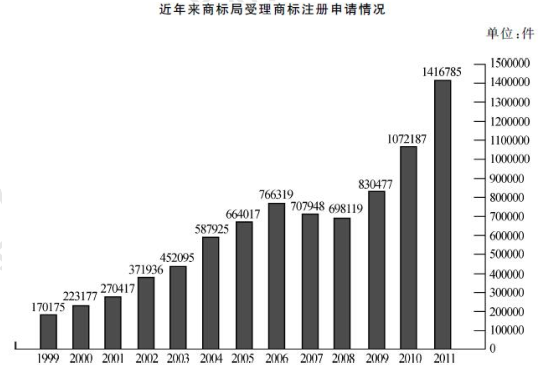 2011年,商标局共受理商标注册申请1416785件,同比增长32.1%,再创历史新高,连续十年位居世界第一。其中商标注册网上申请达804926件。