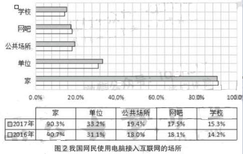 下图是我国网民周平均上网时长和使用电脑接入互联网的场所图表,截止2017年12月,我国网民在家里通过电脑接入互联网的比列为90.3%,在网吧通过电脑接入互联网的比例为17.5% 根据所给资料,2017年在单位使用电脑接入互联的比例占全体使用电脑接入互联网场所的比例比2016年提升了()