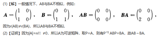 设A,B为n阶矩阵. (1)是否有AB~BA;(2)若A有特征值1,2,…,n,证明:AB~BA.