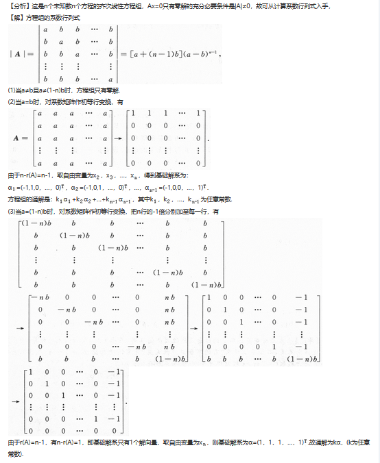 其中a≠0,b≠0,n≥2.试讨论a,b为何值时,方程组仅有零解,有无穷多组解?在有无穷多组解时,求出全部解,并用基础解系表示全部解.