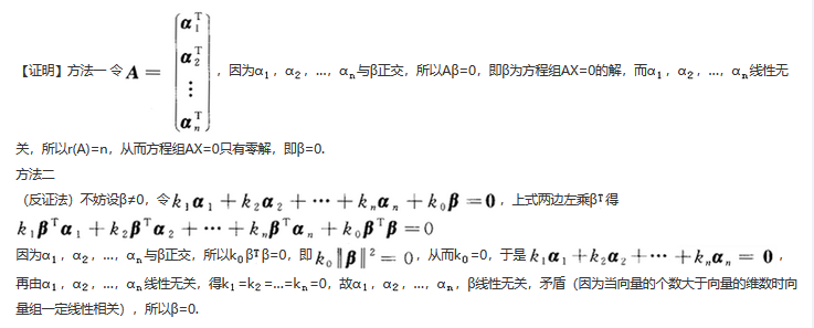 设α1,α2,…,αn为n个线性无关的n维列向量,且与向量β正交.证明:向量β为零向量.