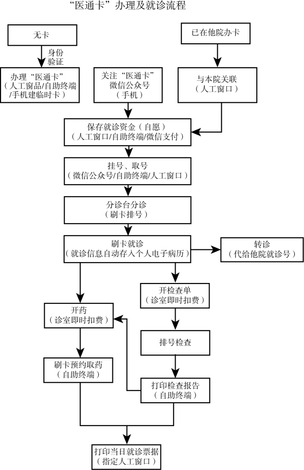 下面是B市人民医院门诊大厅张贴的“医通卡”办理及就诊流程图: