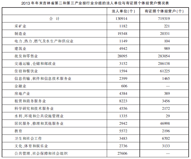 2013年年末,吉林省共有从事第二产业和第三产业活动的法人单位130914个,比2008年(2008年是第二次全国经济普查年份,下同)增加6487个,增长5.2%;产业活动单位157542个,增加5490个;个体经营户972280个,减少12861个。其中:有证照个体经营户719319个,增加50818个。
