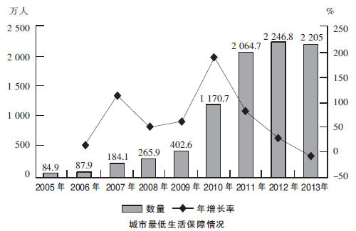 根据上图,2005—2013年,城市最低生活保障人数年增长率最高的年份是哪一年?()