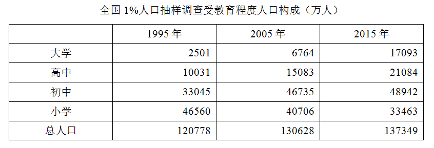 2015年全国1%人口抽样调查主要数据公报显示,同2010年第六次全国人口普查相比,2015年每10万人中具有大学教育程度人口由8930人上升为12445人;具有高中教育程度人口由14032人上升为15350人;具有初中教育程度人口由38788人下降为35633人;具有小学教育程度人口由26779人下降为24356人。