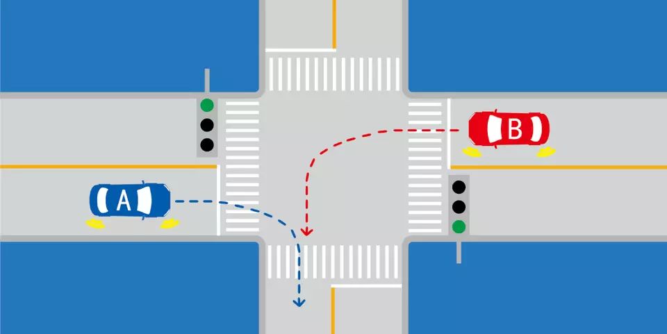 如图所示,在这种情况下,A车具有优先通行权。