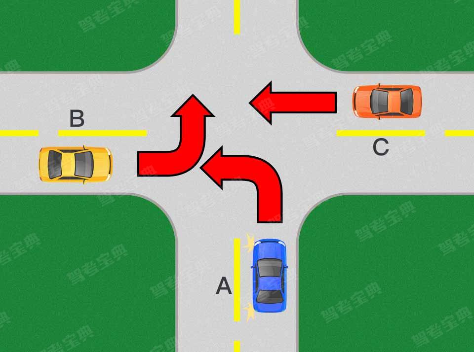 如图所示,___应当最先通过路口。(图中箭头代表行驶方向)