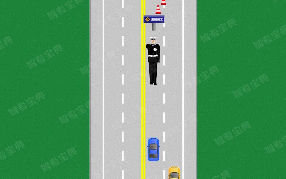 如图所示,交通警察右臂向前平伸,掌心向左,并向左水平摆动。该手势信号示意车辆腾空指定的车道,减速慢行。