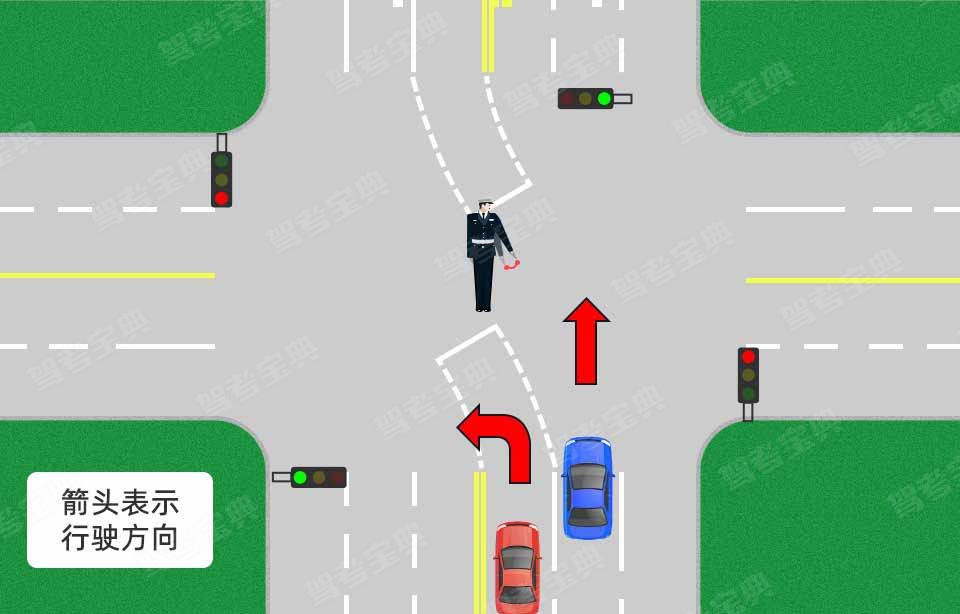 <p>如图所示,交通警察左臂向左下方平伸,掌心向下,左臂与手掌平直向下方摆动。该手势信号示意车辆驶入左转弯待转区。<img sr