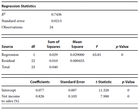 Kenneth McCoin, CFA, is a challenging interviewer. Last year, he handed each job applicant a sheet of paper with the information in the following table, and he then asked several questions about regression analysis. Some of McCoin’s questions, along with a sample of the answers he received to each, are given below. McCoin told the applicants that the independent variable is the ratio of net income to sales for restaurants with a market cap of more than $100 million and the dependent variable is the ratio of cash flow from operations to sales for those restaurants. Which of the choices provided is the best answer to each of McCoin’s questions?